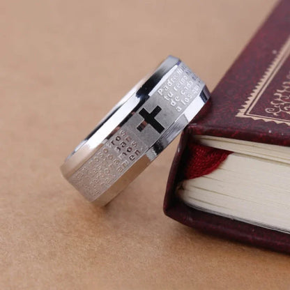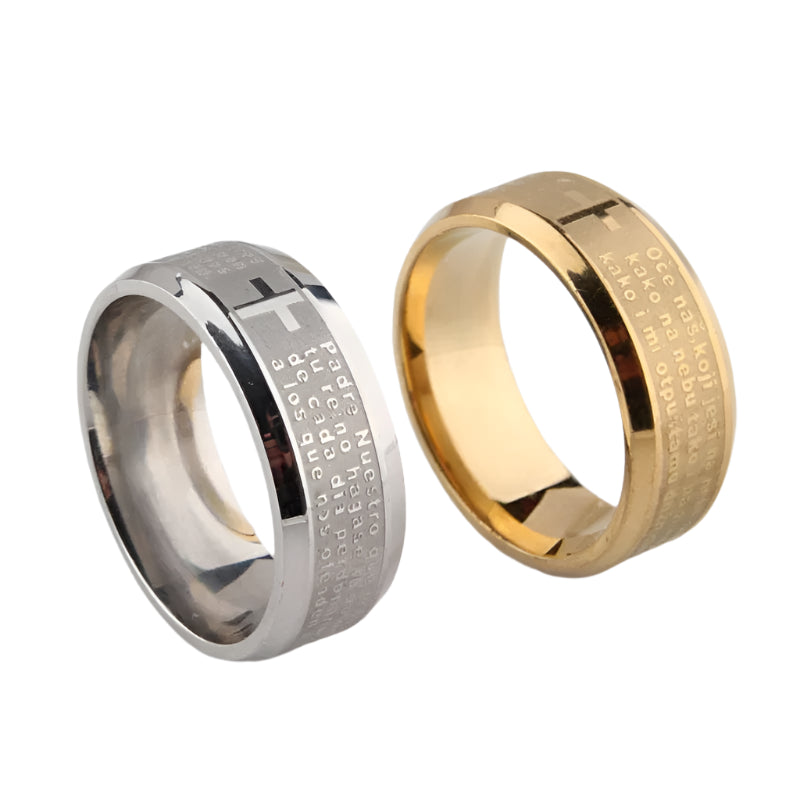 Make a bold statement of faith and style with this Fashion Punk Style Men’s Bible Ring. Engraved with the Spanish version of the Lord’s Prayer (Padre Nuestro), this ring is more than just an accessory — it’s a symbol of devotion, strength, and identity. Crafted with a modern punk aesthetic, it features a sleek metallic finish and a cross emblem, making it perfect for daily wear or special occasions. Ideal for Christian men who value meaningful jewelry, this ring also makes a thoughtful gift for friends, fathers, or anyone proud of their faith and heritage.